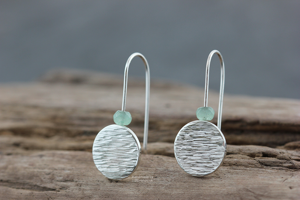 Sterling silver line hammered coin earrings with a pale green faceted Aventurine semi-precious bead. Simple thread through design with a clip at the back for extra security. Length from top to tip: 29mm Coin size: 13mm Handmade in Eco/recycled silver at the inSilver studio.