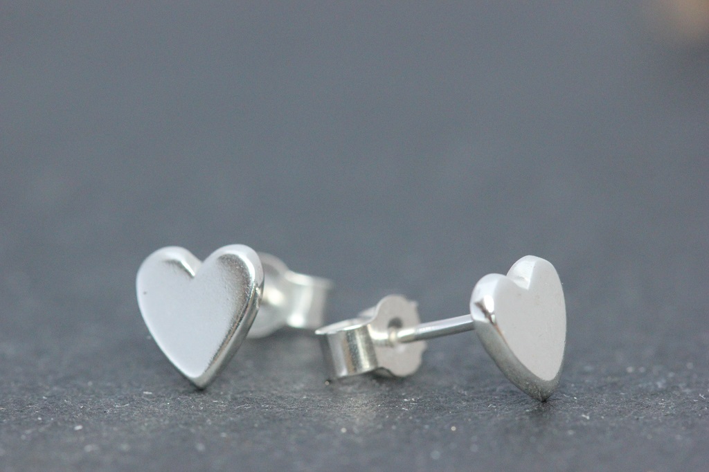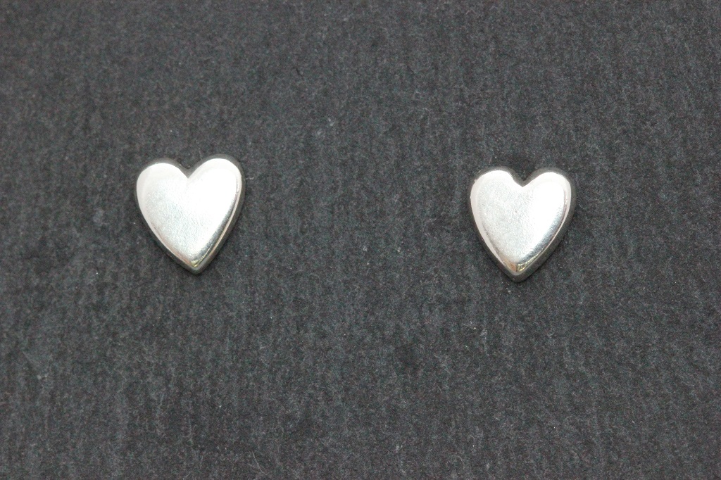 Simple Sterling Silver heart ear studs, shiny mirror finish.
