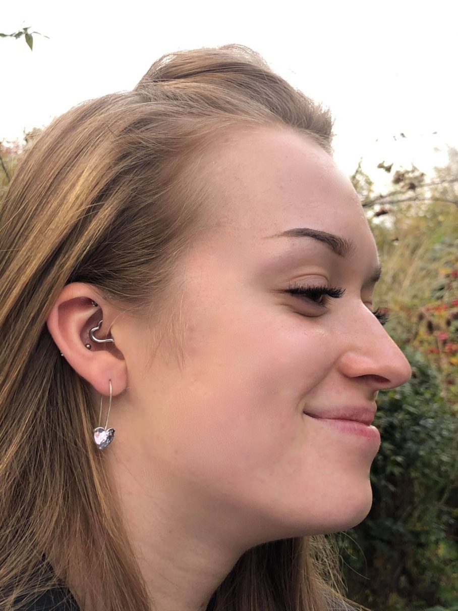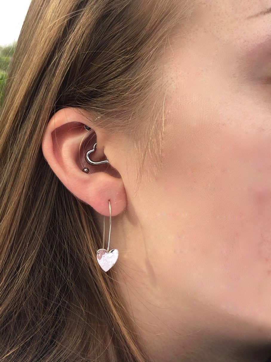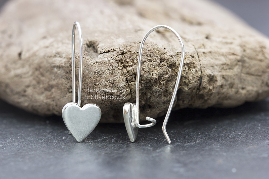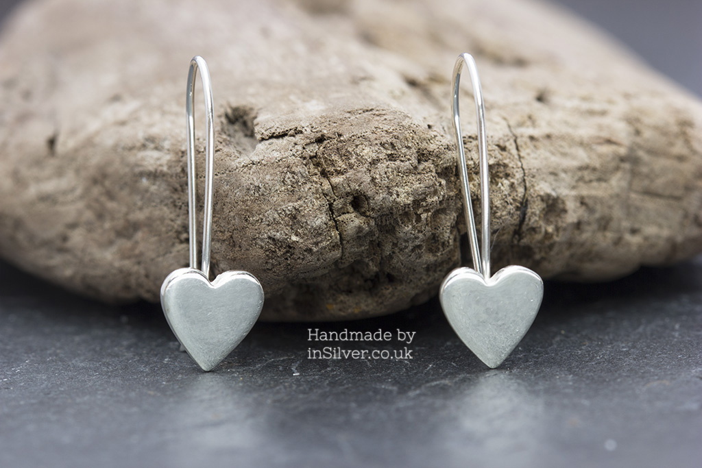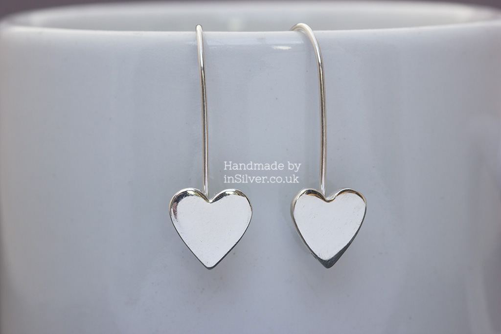 Sterling silver shiny heart thread through earrings with a safety hook for security. Length from top to tip: 30mm Hand made at the inSilver Studio. Model wears glitter hammered heart earrings.