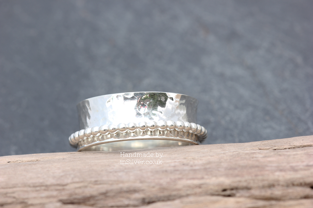 Sterling silver Spinner Ring with the sparkly, glitter hammered finish. To the centre is a free-spinning twisted ring, in a Beaded style. Ring depth approximately: 9.5mm. Size:  V Handmade at the inSilver studio. Hallmarked in Birmingham. Turnaround time to order out of stock sizes is up to 21 days.