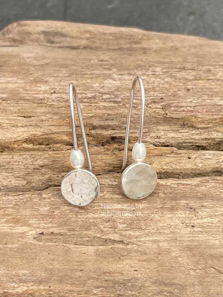 Sterling silver hammered disk earrings with a iridescent white freshwater pearl bead. The hammered effect on the disks glistens as it catches the light to contrast with the smooth beads. Simple thread through design with safety clip for security. Length from top to tip approximately: 25mm Hand made in ecosilver and recycled silver at the […]